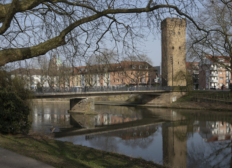 87 Jahre liegen zwischen den beiden Fotografien oben und unten. Und die Motive vom Götzenturm, von der Brücke über den Neckar und der Wohnbebauung am Neckarufer veranschaulichen deutlich den Wandel im Heilbronner Stadtbild. Der „Eiserne Steg“ von 1939 ist einer Steinbrücke gewichen, der Neckar ist stadtseitig zugänglicher geworden. Zudem hebt sich die aktuelle Wohnbebauung vom Hausbau der früheren Altstadt ab.