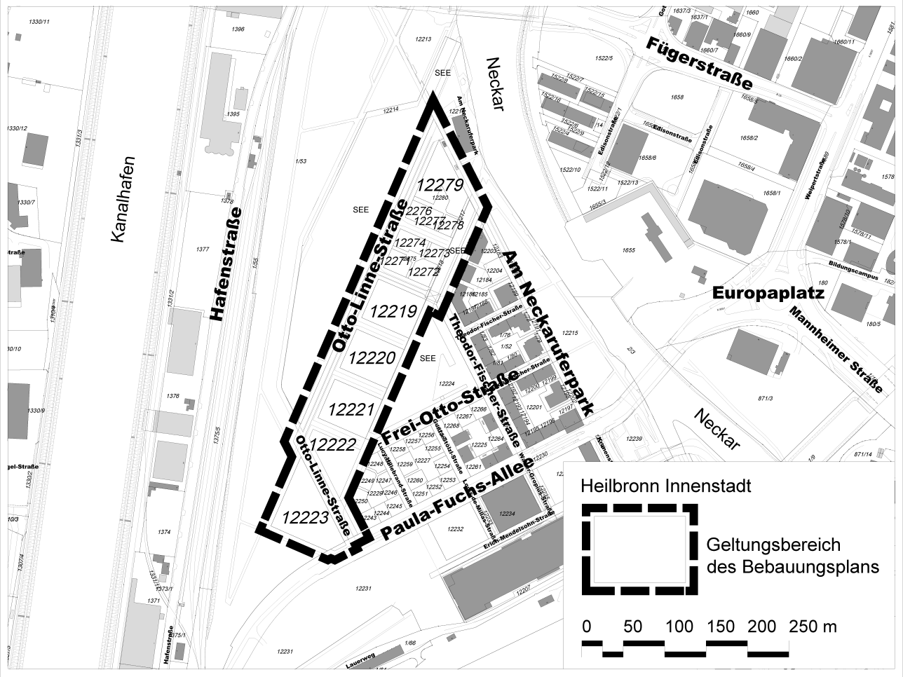 1/53 teilw. (Otto-Linne-Straße), 12216 teilw. (Am Neckaruferpark), 12217, 12218, 12219, 12220, 12221, 12222, 12223, 12224 teilw., 12230 teilw. (Paula-Fuchs-Allee), 12271, 12272, 12273, 12274, 12275, 12276, 12277, 12278, 12279, sowie 12280 (siehe Übersichtspläne).