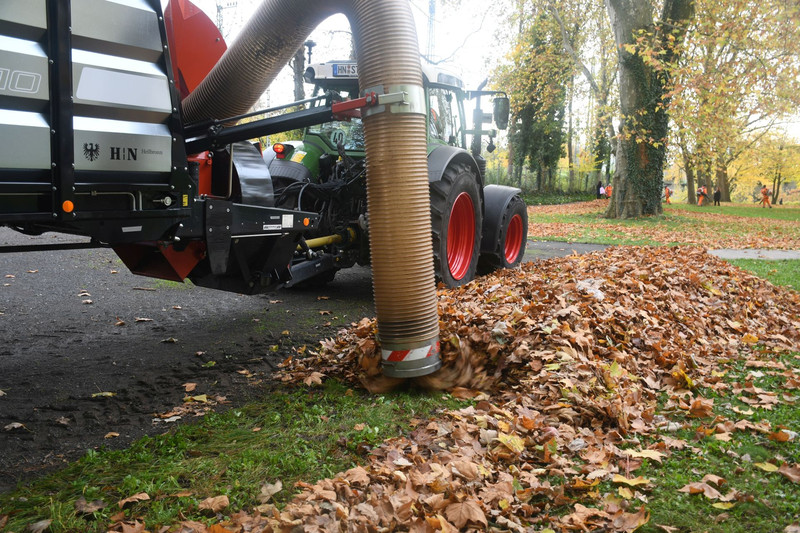 Der "Laubelefant" saugt die aufgeschichteten Laubhügel in einen Anhänger zum Abtransport. Eine Turbine sorgt für die nötige Kraft.
