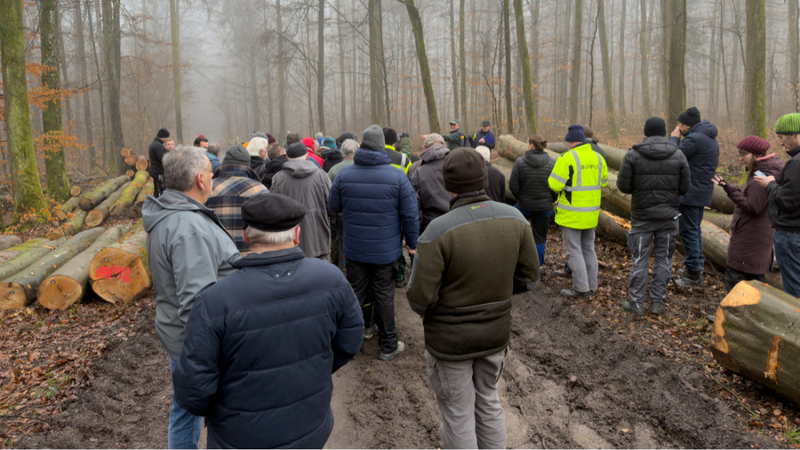 Nach der Einführung durch Revierleiter Steiner setzt sich die Gruppe in Bewegung. Von Polter zu Polter führt der Weg durch den Stadtwald. An jedem Halt nennt er den Startpreis. Die Gebote steigen in festen Schritten, bei Brennholz lang in Fünf-Euro-Schritten, bei Flächenlosen in Zehnerschritten, bis der Zuschlag erfolgt.
