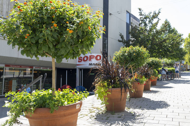 Bunte Blumentöpfe bringen Farbe in die Innenstadt