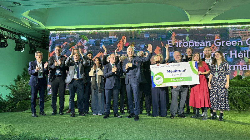 Jubel bei der Heilbronner Delegation in der litauischen Hauptstadt Vilnius: Am 2. Oktober gewinnt Heilbronn den European Green Capital Award 2027 für seinen konsequenten Weg zur nachhaltigen Stadtentwicklung. Der Preis, der von der Europäischen Kommission vergeben wird, ist mit 600.000 Euro dotiert und rückt Heilbronn 2027 als grüne Hauptstadt Europas ins Rampenlicht. Im Titeljahr wird Heilbronn Gastgeberin für internationale Fachkonferenzen, Kulturveranstaltungen und Bürgerprojekte sein und erwartet zahlreiche Gäste aus dem In- und Ausland. Foto: Stadt Heilbronn/M.-K. Klöppel