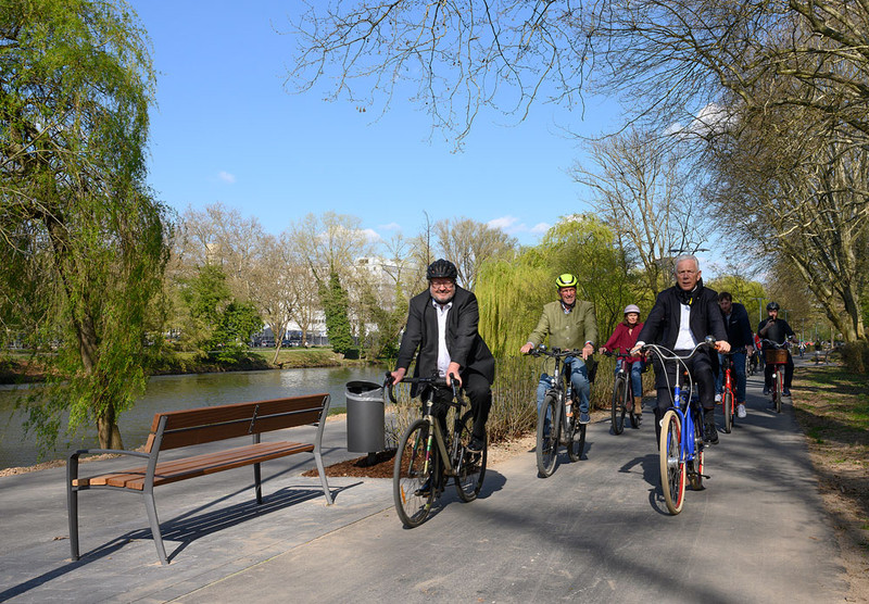 Bietet nun viel Platz: der Neckarufer-Radweg von der Innenstadt Richtung Wertwiesenpark. Zur Eröffnung Ende April machten Oberbürgermeister Harry Mergel (r.), Bürgermeister Andreas Ringle (l.) und Mitglieder des Gemeinderats eine Testfahrt. Foto: Stadtarchiv Heilbronn/B. Kimmerle
