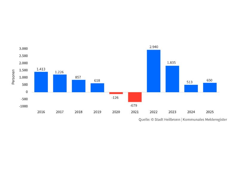 Eine weitere Grafik zeigt die Wanderungsbewegungen in Heilbronn, also die Summe der Zuzüge und Wegzüge nach und von Heilbronn (Grafik unten). Die Balken verdeutlichen: Bis auf die Corona-Jahre 2020 und 2021 mit den starken Einschränkungen hat Heilbronn immer eine positive Bilanz. Es ziehen mehr Menschen her als fort, Heilbronn wächst. „Dieses Wachstum gibt es seit dem Jahr 2006. Das ist schon eine besondere Entwicklung in Baden-Württemberg“, erklärt Isabelle Metzger, Leiterin der Kommunalen Statistikstelle.