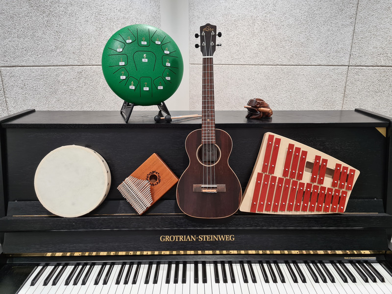 Mit den Neukäufen hat die Stadtbibliothek auf die große Nachfrage reagiert. Bei den größeren Instrumenten sind Alt-Glockenspiel, Tenor-Ukulele und Steel Tongue Drum dazugekommen. Bei den kleineren Instrumenten steht neben Kalimbas, Handtrommeln und Holzfrosch auch ein Triangel-Set neu zur Verfügung. Unabhängig von musikalischer Vorerfahrung ist es das Ziel, einen unkomplizierten Einstieg und Zugang zu Musik zu bieten. Die neuen Sets mit Rasseleiern sind von ihrem Umfang her darüber hinaus gut für den Einsatz in kleinen Gruppen geeignet.