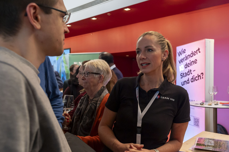 Am Infostand des KI-Teams Heilbronn im Foyer der Harmonie. Stadt-Mitarbeiterin Monika Bolz informiert über die Entwicklung von Angeboten zu Künstlicher Intelligenz in Heilbronn. (Foto: Jürgen Häffner)