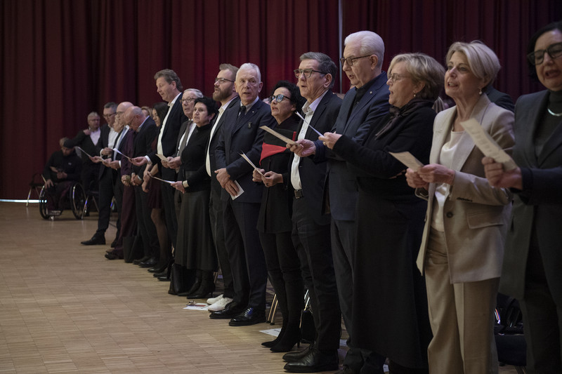 Klassischer Abschluss des Bürgerempfangs: Der ganze Saal mit vielen Prominenten singt gemeinsam das Lied „Kein schöner Land in dieser Zeit“. (Foto: Stadtarchiv/B. Kimmerle)