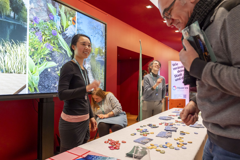 Am Infostand der Bürgerbeteiligung. Stadt-Mitarbeiterin Yasemin Özbek erläutert Prozesse, wie Bürgerinnen und Bürger in städtische Entscheidungen eingebunden werden. (Foto: Jürgen Häffner)