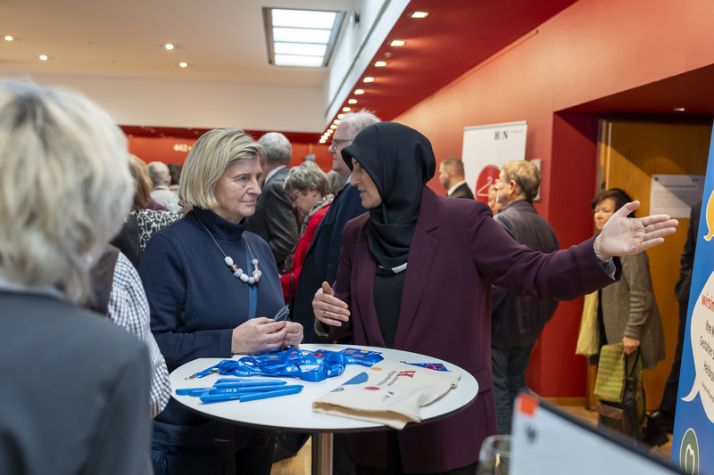 Austausch im Foyer bei Snacks und Getränken: Viele Gäste kamen im Anschluss an das Programm ins Gespräch. (Foto: Jürgen Häffner)