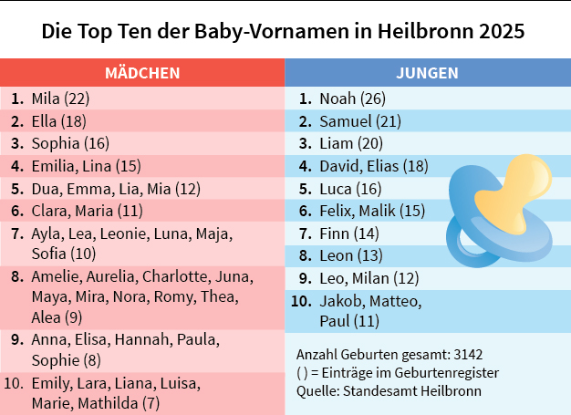 In der Hitliste der Babynamen in Heilbronn gab es im Jahr 2025 einiges an Bewegung: Im Geburtenregister des Heilbronner Standesamts stehen die Vornamen Mila bei Mädchen und Noah bei Jungen eindeutig an der Spitze. 22 Mal nannten Eltern ihre Tochter Mila, 26 Mal entschieden sich die Eltern bei Jungen für Noah. Insgesamt kamen im abgelaufenen Jahr 3142 Kinder in Heilbronn zur Welt – ein Plus von 205 Babys gegenüber dem Jahr davor.