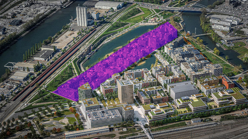 Damit die Aufsiedlung des Neckarbogens weitergehen kann, läuft aktuell das Bebauungsplanverfahren für den Neckarbogen West (hier violett markiert). Visualisierung: Jens Gehrcken, Stadt Heilbronn/Machleidt GmbH