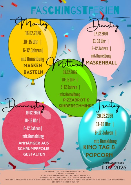 - 18. Februar, 10 bis 15 Uhr: Pizzabrötchen & Kinderschminken - Wir backen gemeinsam Pizzabrötchen und jedes Kind lernt sich selbst für den Karneval zu schminken .