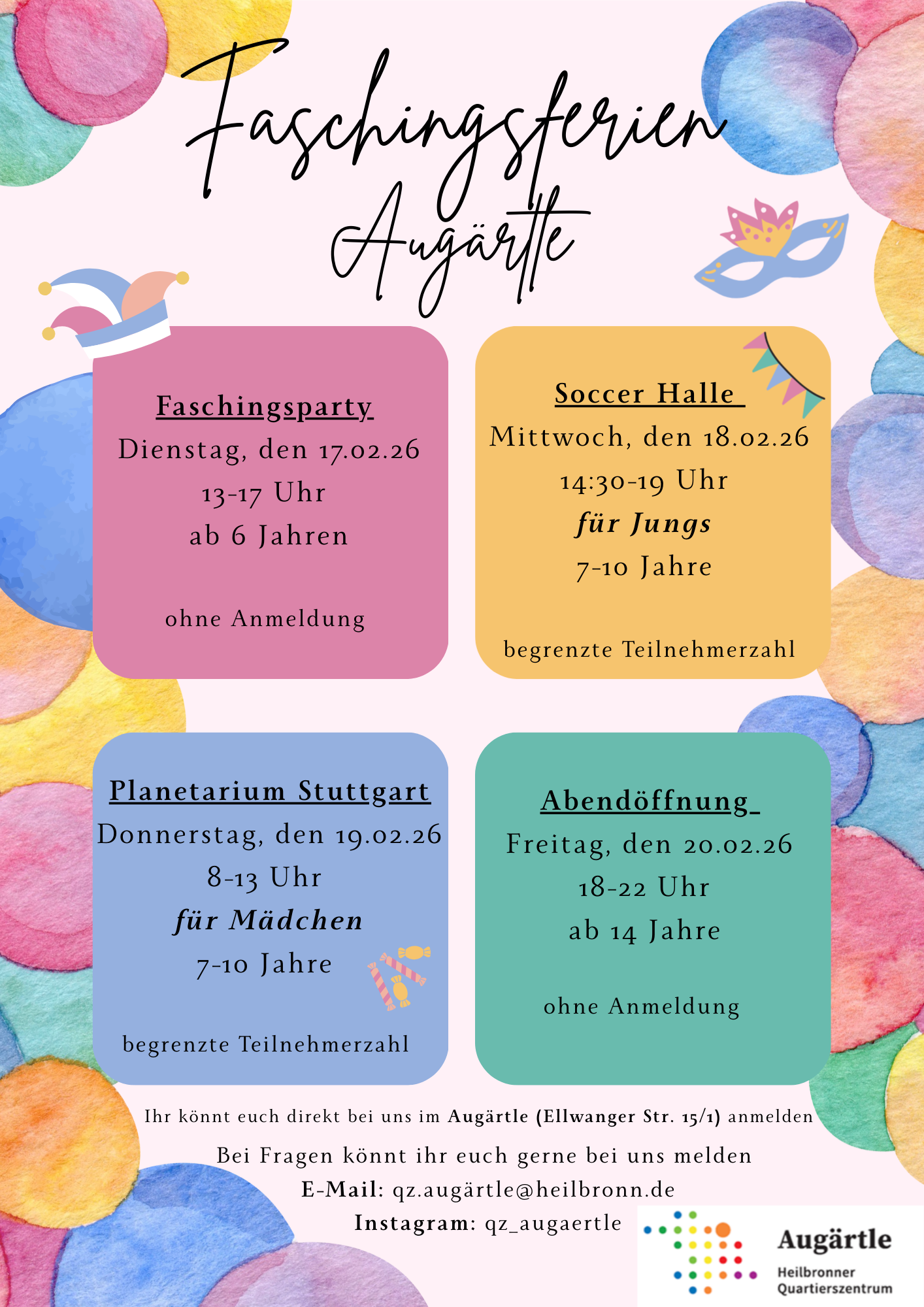 In den Faschingsferien erwarten Kinder und Jugendliche abwechslungsreiche Aktionen im Quartierszentrum Augärtle und darüber hinaus: