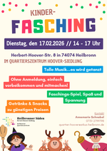 Im Quartierszentrum Hoover-Siedlung findet am Dienstag, 17. Februar, von 14 bis 17 Uhr die Kinderfaschingsfeier für Kinder zwischen sechs und zwölf Jahren statt. Der Eintritt ist frei. Eine vorherige Anmeldung ist nicht erforderlich.