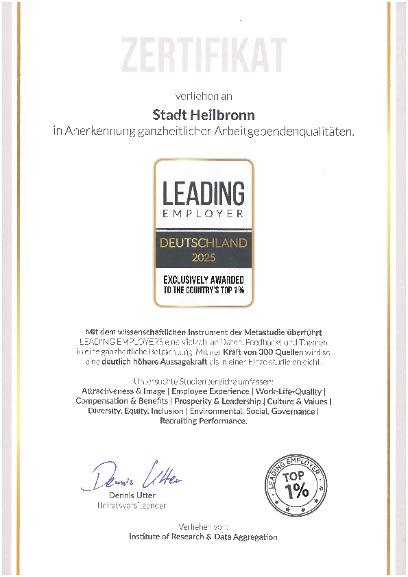 Die Stadt Heilbronn ist einer der führenden Arbeitgeber Deutschlands und erhält, bereits zum dritten Mal in Folge, im Jahr 2026 die Auszeichnung als „Leading Employer“ von der Hamburger Institute of Research & Data Aggregation GmbH.
