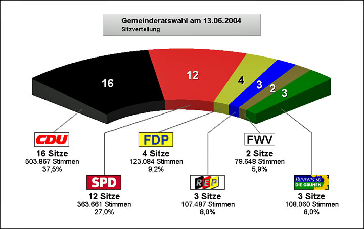 Bei der Wahl zum Heilbronner Gemeinderat am 13. Juni 2004 erhielten die CDU 37,5 Prozent der Stimmen (1999 38,6 Prozent), die SPD 27,0 Prozent (29,5), die FDP 9,2 Prozent (9,7), die Republikaner 8,0 Prozent(8,3), die Freie Wählervereinigung 5,9 Prozent (6,5) und die Grünen 8,0 Prozent (6,5). Auf die sonstigen Parteien entfielen 4,3 Prozent der Stimmen.